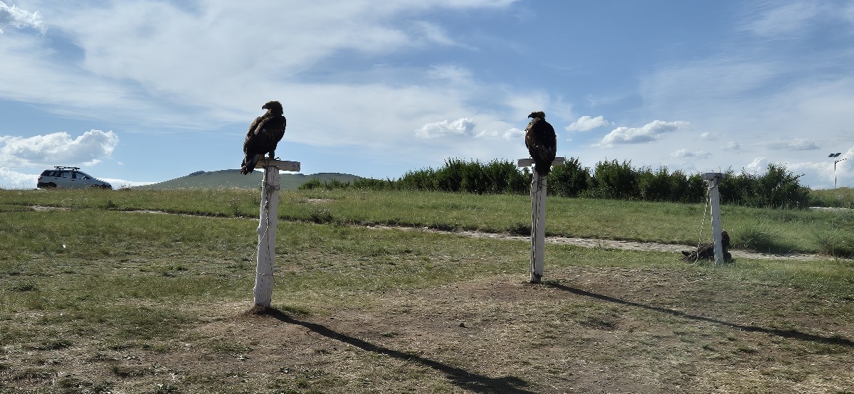 돌무지 바로 앞에 독수리 두마리가 발을 묶인 채로 앉아있다. 관광객들에게 3불을 받고